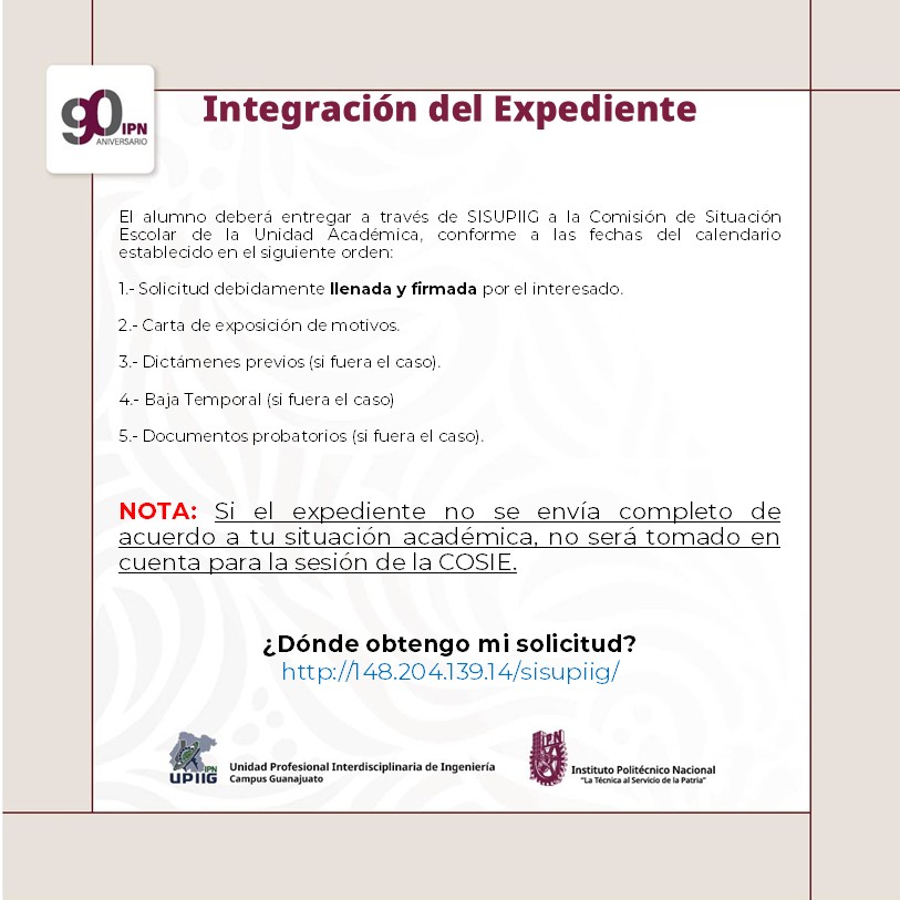 El alumno deberá entregar al secretario de la comisión de situación escolar de la Unidad Académica, con forme a las fechas del calendario establecido, en el siguiente orden: